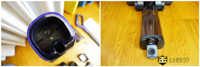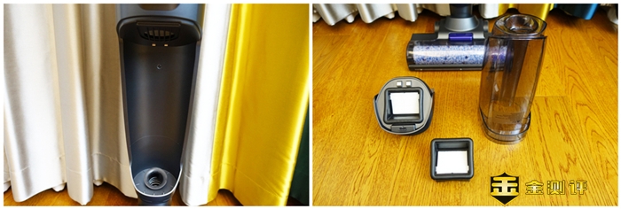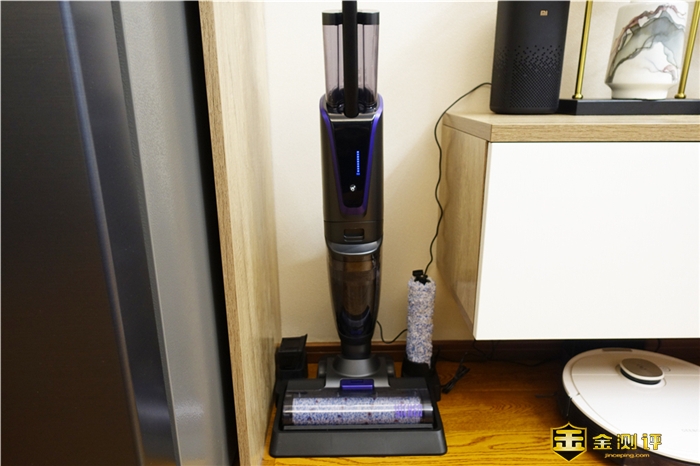 逸尘杀菌洗地机 2 PRO配有专用的充电底座,这个底座的设计也非常的新颖,不仅可以让洗地机进行充电,而且底座两边还可以放置刷头和HEPA滤芯,充电的方式采用的是直立接触式的充电方式。