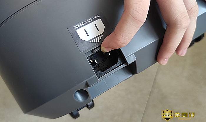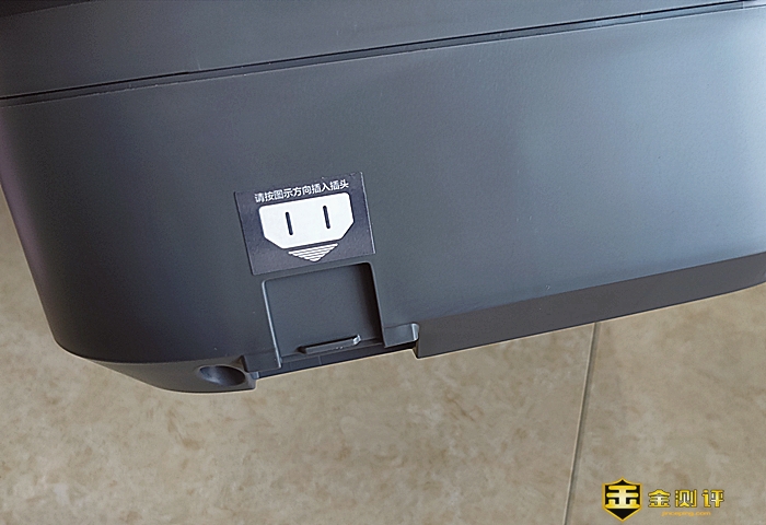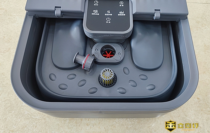 足浴器的前侧面底座靠左的位置设置了电源接口,接口有拉盖盖住,泡脚按摩完成后,拔出电源线后,拉盖自动关闭密封,防尘防水。