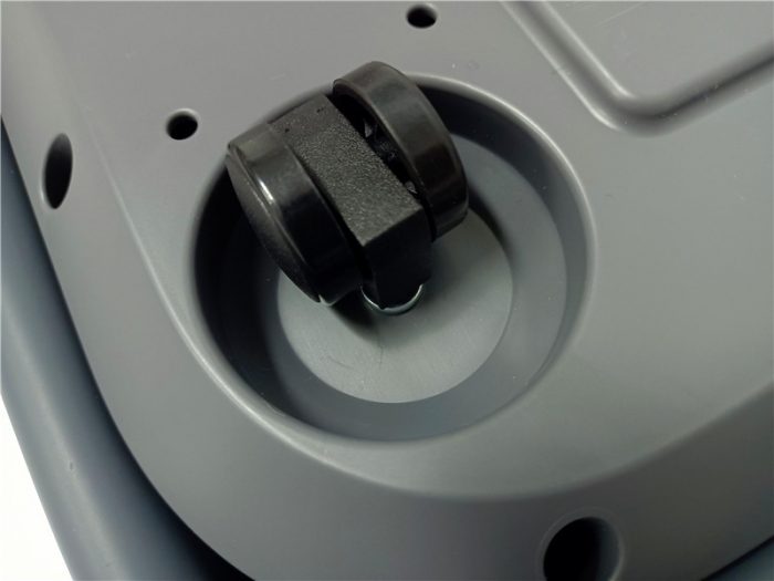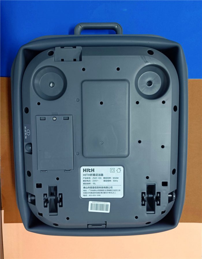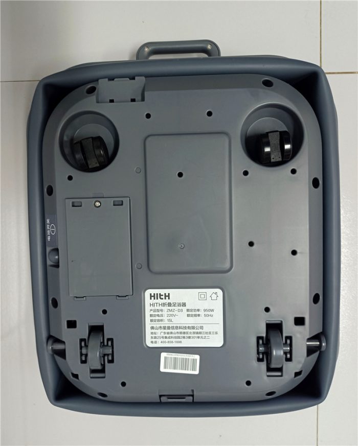 HITH智能自动折叠足浴器D3底部能够看到足浴盆的四个轮子安装位置,可以手工将四个轮子安装到上面,左边的位置能够看到有一个完全包裹的电池开关按钮,中间的标签写有HITH智能自动折叠足浴器D3的相关参数信息,能够看到这款足浴盆的额定容积为15L,可以说是比较大了,因为放了更多的水才能更舒服的洗。