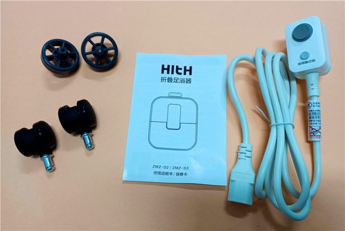拿到这款足浴器的第一个感觉就是这个足浴器非常的大气,但是有这么矮的么?别着急,这是这款足浴器的秘密武器,这款足浴器是可以折叠的,所以外包装和足浴器都是非常的精致的,整体外观好像一个正常的背包一样大小。能够看到足浴盆的盖子部位是使用纸胶带粘贴着的,这个是为了防止运输中造成盖子顺坏的,另外我们也都知道纸胶带接下来的时候是不会留下痕迹的。足浴盆的配件就三个分别是轮子两对,说明书一份以及电源线一根。
