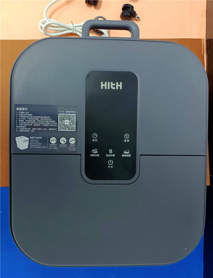 从正面看HITH智能自动折叠足浴器D3感觉就是这款足浴器的外观设计的更端庄更正式。从正面也能够看到足浴器的控制按钮都是触控设计的,这个我个人感觉比物理按键更方便耐用。在功能键上也能够看到自动升降的功能键,其他功能包括定时、温度、加热冲浪、脚底按摩,具体功能在体验使用具体讲解。