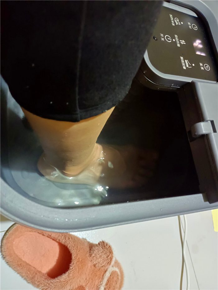 继续加水加热后就可以入脚享受了,另外足浴器内部是有足浴器最高防水量的,这里切不可加水过多,另外加热过程中可以将足浴器的盖子盖上,这样更有利于水加热,足浴器可以根据个人需要可以调控温度,可调温度范围为35摄氏度-48摄氏度,我老婆喜欢41摄氏度的水。