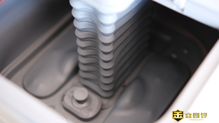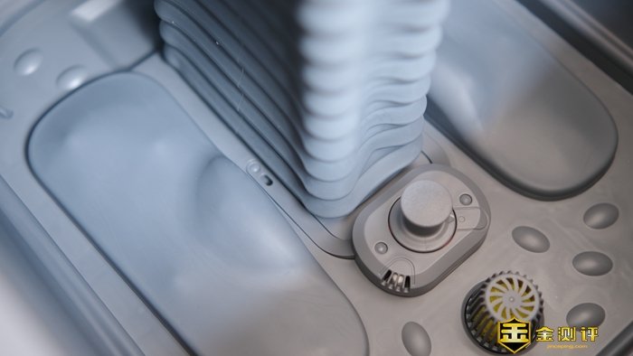 足浴盆升起后,可以看到整个内舱由灰色软胶包裹,一体化的内舱设计,除拥有更好的防水性能外,也更加方便日常用后打理。并且中间的升降机也由同样折叠式的软胶包裹,可以保证升降机的长久使用。