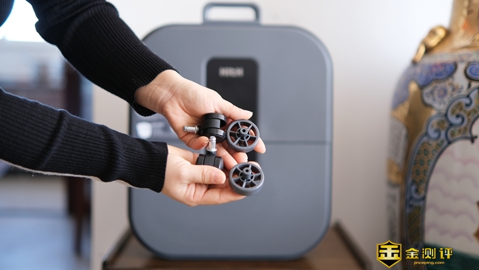 箱子内除使用说明书外,还配备了一根电源线和四个轮子,并且轮子两两一组,其中有两个是万向轮。