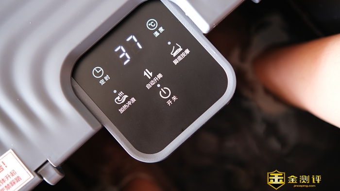 HITH足浴盆正面中央是现实屏,共设置了六个触控按钮,分别为电源开关、定时、温控、加热冲浪、自动升降和脚底按摩,简约设计之下却充满了便捷的科技感。