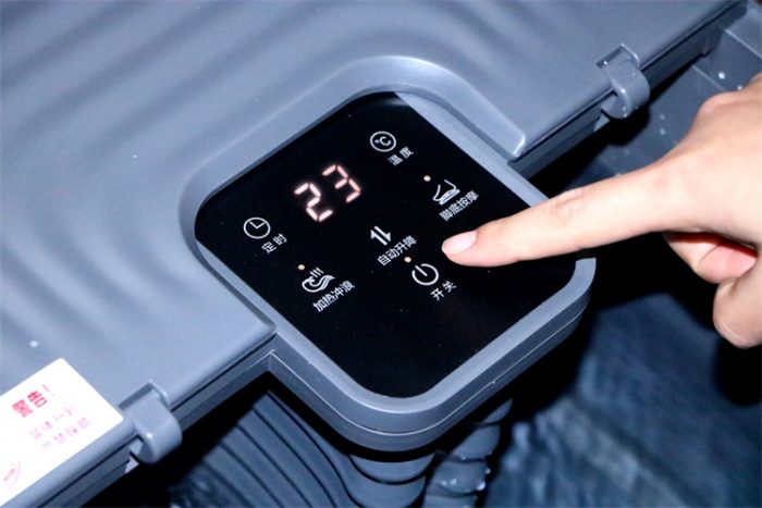 产品的基本结构和特征介绍完了我们就一起来看看使用方面了,操作上我们可以通过足浴器正面中间的触控板来完成,触控板上还带有电子显示屏幕可以显示温度时间等的信息,通过触控板内容来看我们可以了解到本款足浴器可支持定时操作、温度调节(35°-48°可调)操作、加热冲浪、脚底按摩等。