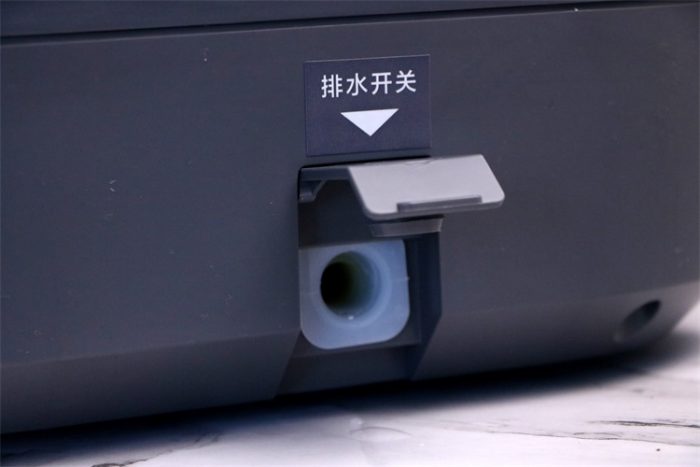 看完了产品的内部结构了我们再来看下产品的外部设置,例如在产品后侧下方的排水口,这个排水口在足浴器折叠状态下是隐藏着的,当足浴器升起之后便可以看到,排水之时打开即可,小编亲测排水效果还是不错的,即使盆内水量少的时候也能呈水柱状态排出没有过多的水滴漏。