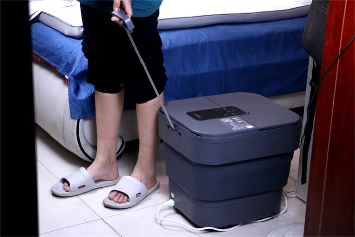 起初在拿到这款产品的时候小编是有一个疑问的,就是拿到的产品包装箱没有想象的那么大,所以小编也是在第一时间褪去产品包装直接目睹了产品的真实面目,如上图所示那样,它确实足够小甚至比一个平常用到的洗脚盆占地面积还小,不过要知道它还有按摩恒温等功能呢,再说了这么小也不实用的,实际上它是一款折叠的足浴盆,折叠之后的厚度仅为16cm,可以像上图中所示的那样靠墙收纳,大大的减少了占用空间。
