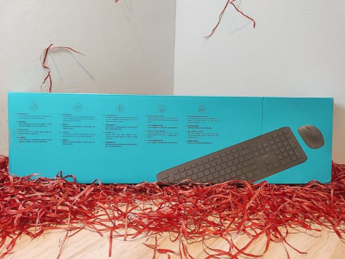言归正传,拿到键鼠套装的时候我是惊艳的,好光亮的外包装!偏窄的造型,不像传统键鼠包装那么笨重,走轻盈纤细路线。配色是孔雀蓝,超级好看,如果以后有出这个配色的键鼠,我可能就自掏腰包去买了,哈哈哈!