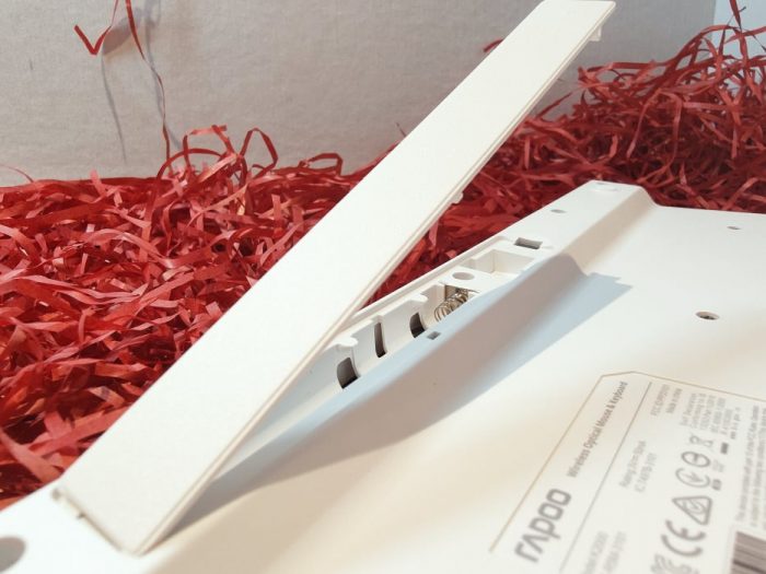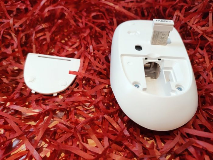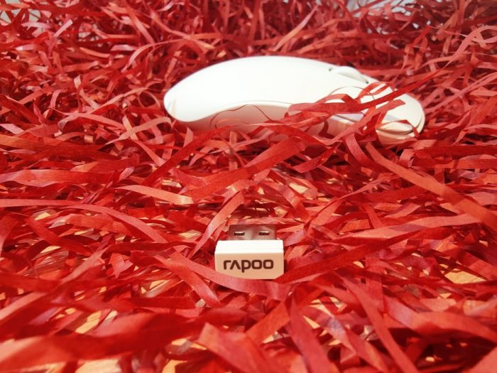接收器本身也是白色,比较显眼,黑灰色标注了rapoo的商标标识。