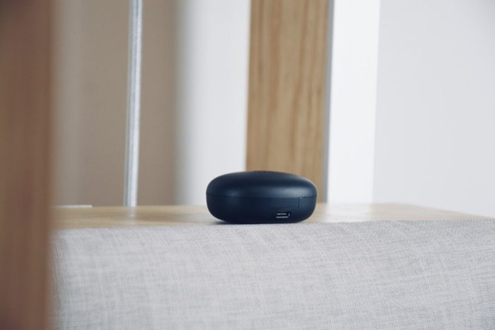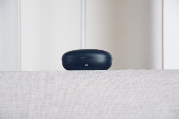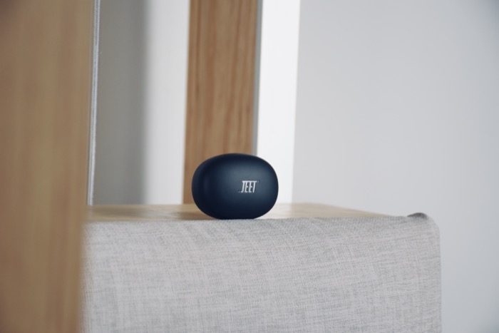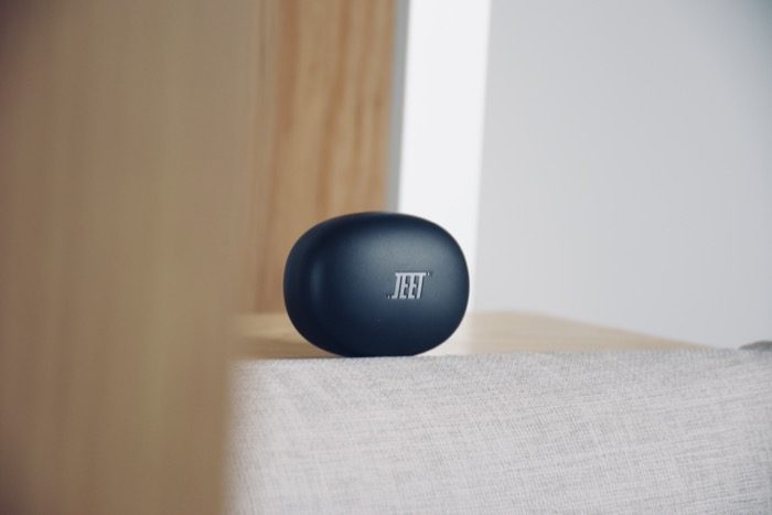 JEET Air2真无线蓝牙耳机充电仓表面是磨砂质感,触感舒适,不容易粘指纹。顶部设计有产品的Logo,底部是耳机的配对按键,按键点击反馈清脆。小巧的设计携带很方便,无论是放在口袋里,还是背包里,都是不错的选择。