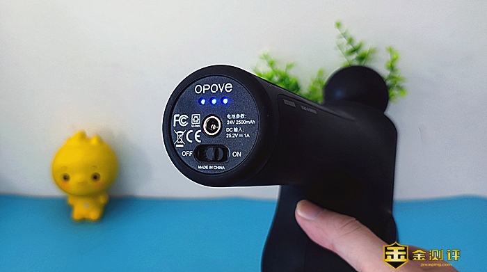 OPOVE APEX筋膜枪的手柄的底部设置了开/关机按键、电量指示灯、充电插孔,并镀有电池参数。