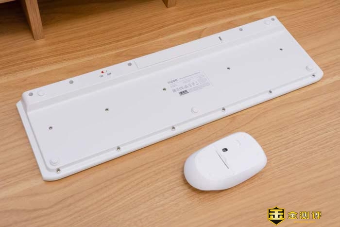 在键盘的底部,可以看到键盘下面有六个硅胶垫脚,除了可以支撑起键盘外,还能起到防滑更稳定以及防噪音的作用。当然,这个键盘没有了可折叠式的垫角,因此键盘的摆放角度是固定的。而再看看鼠标,底部也有个电池仓。无线接收器和电池都是放在这里面。它采用一节5号电池工作,随机出厂有附送电池,开箱后就可以使用。