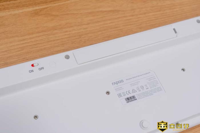 另外键盘可以看到长长的电池仓,它是使用两节7号电池工作的。同样随机也是附着了两节7号电池,上手就可以开始使用。并且这样的电池随处可见,在续航方面永远不用担心。在旁边可以看到一个开关,当OFF的时候是红色的状态显示,提醒键盘是关机的呢。