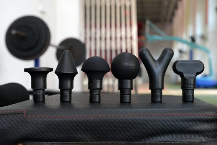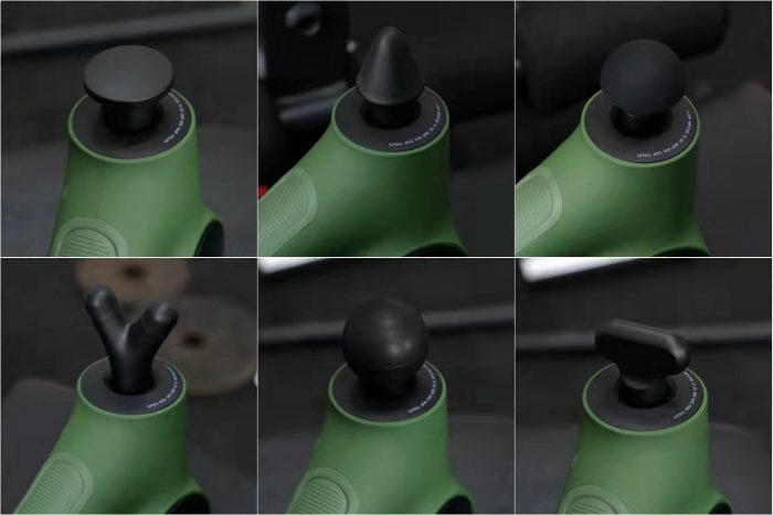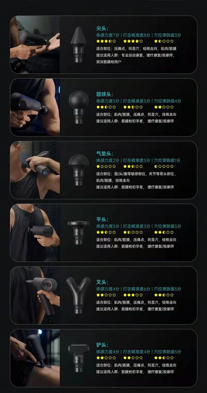 6个按摩头分别是尖头、圆球头、气垫头、平头、叉头和铲头,除了尖头适用于资深筋膜枪用户外,其他5种按摩头都适用于筋膜枪初学者,笔者平时使用最多的还是圆球头和气垫头。