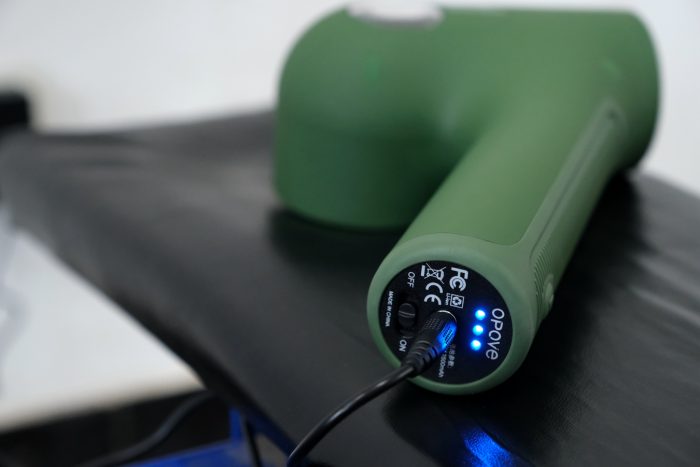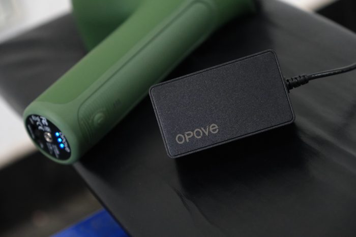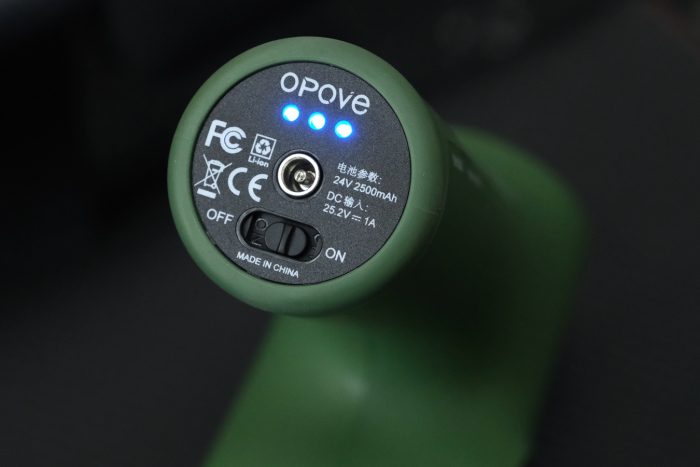 手柄的底部设有DC电源插孔、电量指示灯和电源开关拨键。OPOVE APEX筋膜枪内置了2500mAh锂电池,大约需要2.5到3小时就能让电量“满血复活”,然后就能带来差不多210分钟的使用时间,如果按照每天使用10分钟来计算,那么就可以使用约21天,续航表现相当给力。