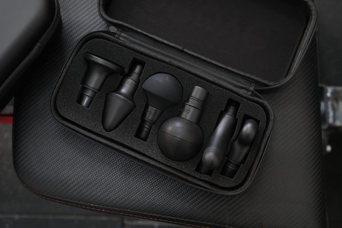 OPOVE APEX筋膜枪的配件包括使用说明书、电源适配器和6种不同类型的按摩头,当然了,便携包也是配件之一。