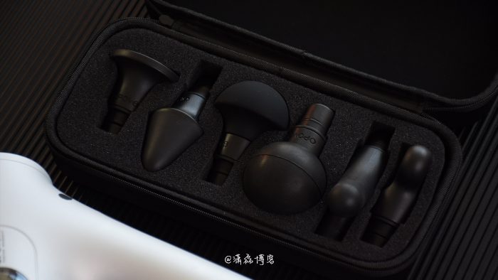 揭开收纳包,筋膜枪主机和电源适配器置于模具中,按摩头放在独立的收纳包中,不难看出OPOVE在包装设计上也十分讲究。