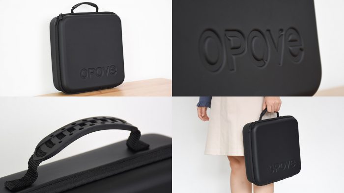包装中还附赠有一个黑色皮革材质的收纳包,日常可以将筋膜枪及附赠的按摩头收纳在其中,无论在居家收纳或是带出门都比较方便。收纳包正面有凹印的OPOVE字样,侧边设计有提手便于携带。
