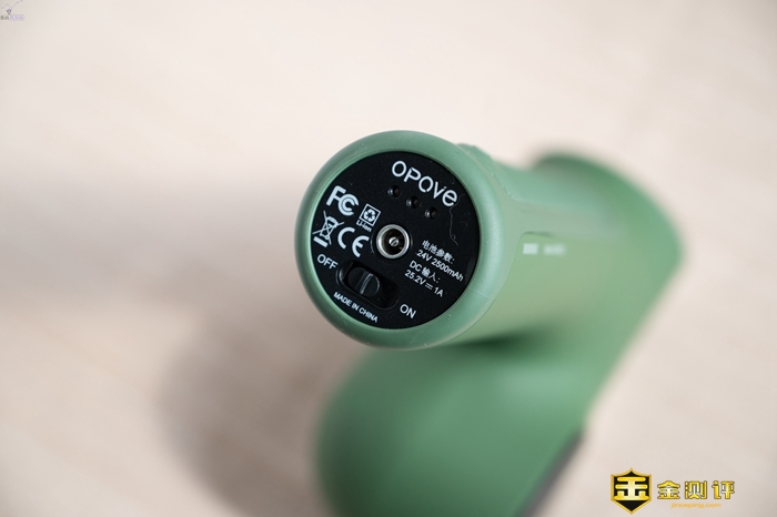 这款筋膜枪把开关放在了底部,打开之后可以通过三枚LED灯来了解当前的剩余电流,它是用DC接口充电的,包装里就有专用的充电器。OPOVE APEX筋膜枪内置了2500mAh的电池,充满电后能够使用210分钟,按每天半小时计算,用上一星期没什么问题,续航表现确实厉害。