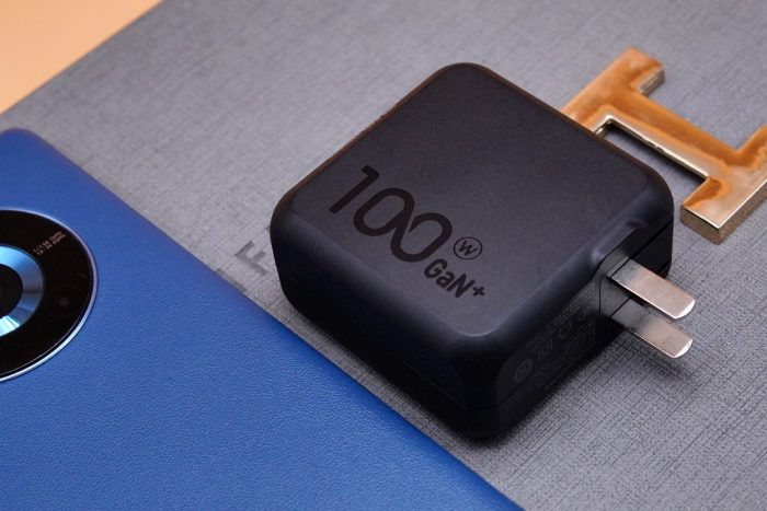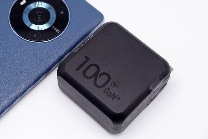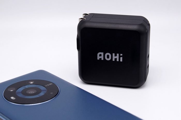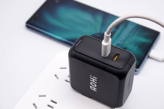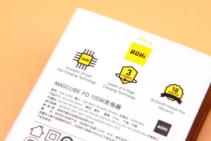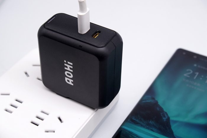 充电器采用全金属材质,整体为方形,黑色外壳经过哑光磨砂处理,边角圆润,入手舒适。一侧印有Aohi的品牌logo,另一侧则印有100 Gan的标识,颜值非常出色。