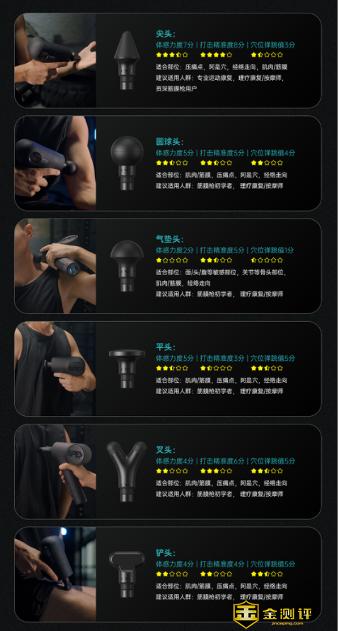 OPOVE APEX筋膜枪采用了人体工程学设计,即使拥有一公斤的自重,但是使用的时候也不会感觉到很重。重力分布非常均匀,45度圆角设计让握持更省力,即使最高档位震动也不会脱手。 每个人根据自己的耐受程度可以选择不同的调节档位。一般来说女生建议一档,男士可以选择二档甚至三档。 每次运动后腿部都会产生酸痛感,专业运动员结束后会有理疗师进行按摩,普通人只能简单韧带拉伸来解决了,有了OPOVE APEX筋膜枪也可以享受到专业的按摩,放松身体各个部位。 圆球头是最常见最具代表性的配件,适合初学者,力度中等,打击精度中等。适合全身各部位的肌肉与筋膜。 每次运动后大腿都会有紧绷感,走路的时候非常僵硬。圆球头刺激大肌肉群是解决此问题的首选方案,当然胸肌臀肌也在此范围内。 使用筋膜枪后可以让肌肉更好更快的恢复,肌肉的紧绷感会得到明显的缓解,走路也不会非常僵硬。 气垫头是6个按摩头中最轻柔的,原因是气垫头的内部是空心的,因此更加柔软,适用于头部和腹部以及敏感肌群用户。 叉型按摩头可同时按摩骨头两侧肌肉,特别适合肩颈、脊柱、跟腱等,力度低精度高,还能穴位按摩。 叉型按摩头很适合工作学习的用户使用,工作学习一天后颈椎疼痛、背部僵硬、酸胀感明显,使用叉型按摩头避开脊骨,通过高频震动让拉伸的肌肉恢复弹性,特别适合背部肌肉群进行按摩。 扁平头接触面积大,力度适中,精度一般,不适合穴位按摩。更适合大面积的肌肉按摩,背部、腿部都可以。 由于扁平头的力度与频率不高,用户适应后可调至中高档进行按摩,可以大面积缓解肌肉疲劳促进血液循环。 尖头力度强打击精度高,属于痛感非常明显的按摩头,适合穴位按摩,一般用于手掌和足底。 尖头力度强不建议新手使用,需要专业人士参考穴位图进行使用,尖头的冲击力非常强,本人初次使用差点被送走,一定不要用于腹部。 铲头为细长条型,力度适中,击打精准,适合长条肌群和经络按摩,力度和精准介于平头和尖头之间。 本人特别喜欢跳绳,锻炼后肌肉僵硬、酸痛很严重,走路也比较僵硬,使用筋膜枪锤击腿部肌肉,对于肌肉僵硬、酸痛有很好得缓解。相比于普通按摩效率更高,整体的效果也要更好。 日常工作学习长时间久坐,很容易导致背部的斜方肌和背阔肌酸痛,使用筋膜枪后可大大缓解肌肉的酸疼,加快血流让肌肉群得到放松。 握柄处内置了2500mAh大容量电池,可以连续使用210分钟,每天使用20分钟,可以满足10天使用,整体的续航能力还是非常不错的。