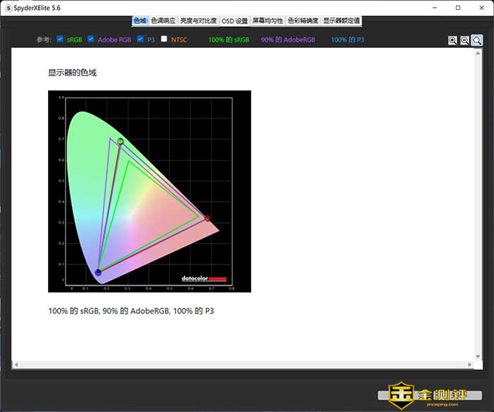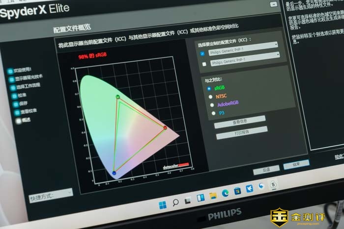 最后还会给显示器得出一个当前ICC配置文件下的色域覆盖和各种标准色域空间的对比。从这也可以大概的评估下当前显示器的专业性能。比如我的这台飞利浦的专业修图显示器,官方宣称sRGB色域覆盖达到99%。而红蜘蛛实测得出是98%,这是在误差范围内的,可以接受。