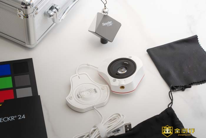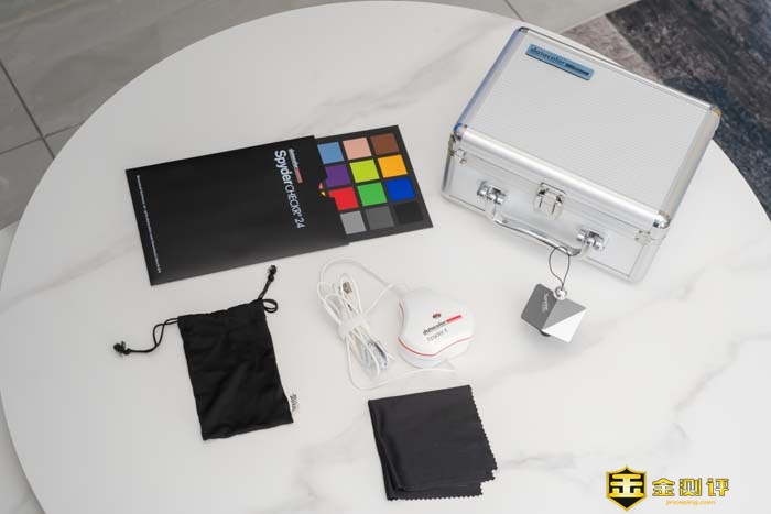 首行可以看到有三个主要的,它们就是Spyder X校色仪,24色色卡和立方蜘蛛。当然,另外还有一个黑色的收纳袋和一块拭镜布。收纳袋可以用来装校色仪,而拭镜布则不管是用来擦镜头还是擦屏幕都是可以的。