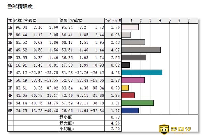 当然,还有一个比较重要的就是色彩的精准度。顾名思义,就是指显示器在显示彩色时的准确程度,一般用Delta E或ΔE来表示。ΔE用来表示显示器实际显示出来的色彩与标准理论值之间的差距的大小。这个值是越小越好,越大说明色彩越失真。当 ΔE值在1.6-3.2之间时,我们的人眼基本上看不出色彩的区别,一般被认为是相同的颜色。ΔE值在3.2-6.5之间时,会现色彩差别,但除了经过专业训练的人,我们普通人也看不到色彩的差别。从我的12色色准测试结果来看,我这台显示器的ΔE值在0.73-4.26之间,平均值ΔE约为2.2。讲真,这个表现还行。
