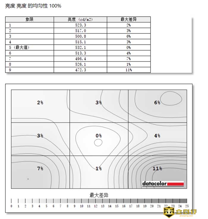 和背光分区电视机不一样的是,我这台显示器的背光并不是分区的。因此理论上来说,高达27英寸的发光面积几乎不可能每个地方的发光亮度都一致。从最终的测试结果可以看出,这台显示器的发光均匀度还行,尤其是右下角和右上角差别比较大。