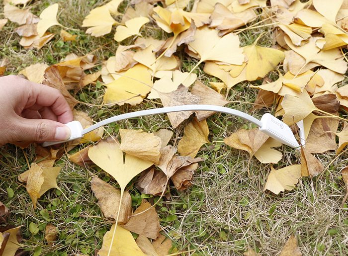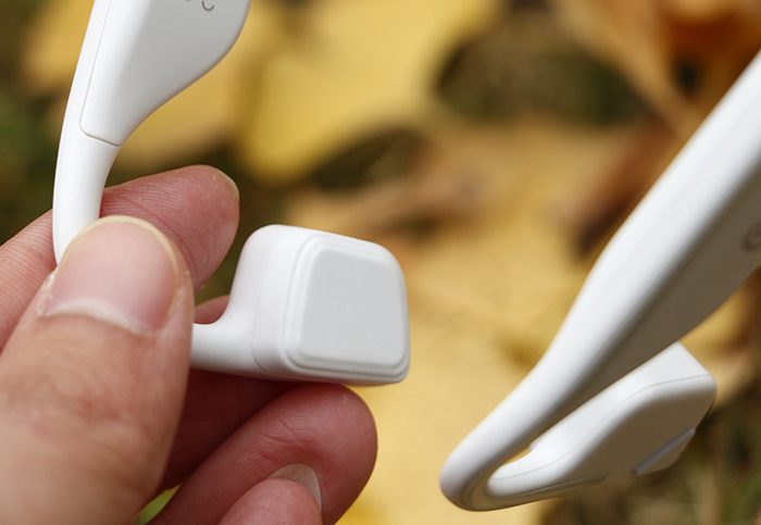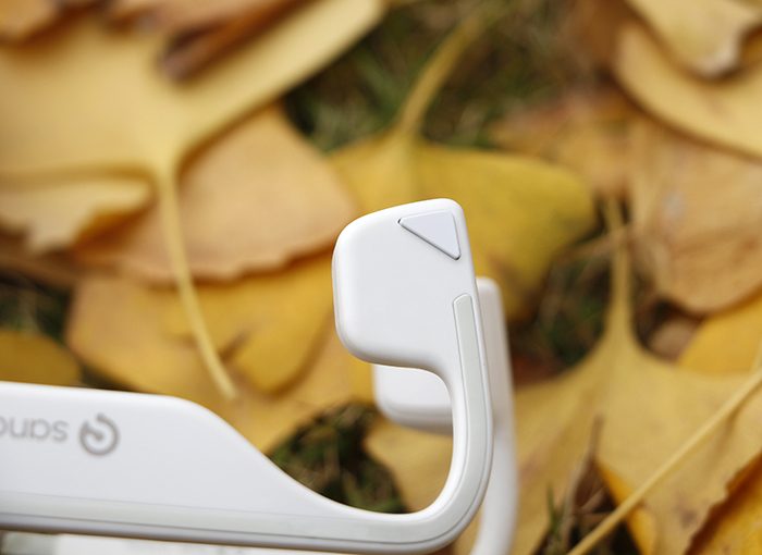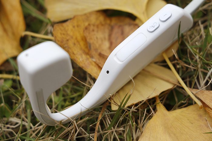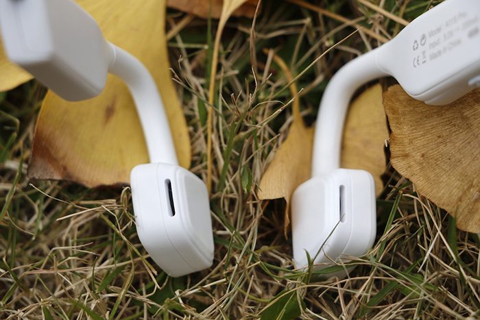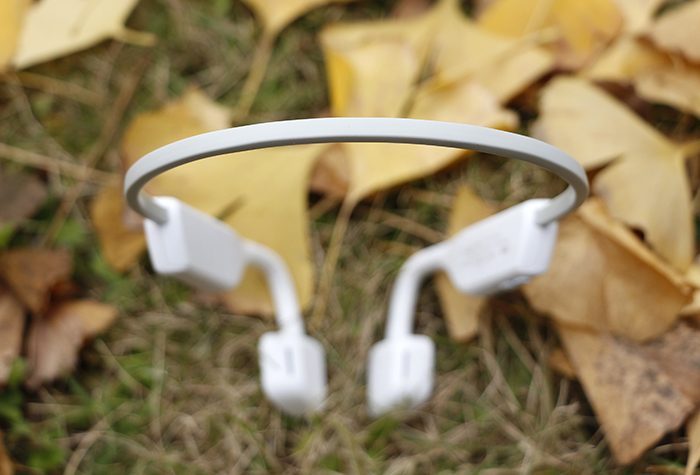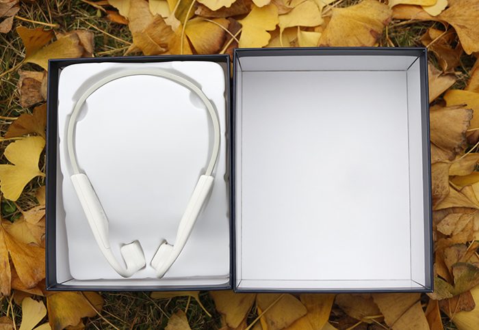 打开包装后,内容也很简单,就是耳机本体,白灰配色,造型即为骨传导耳机的风格。