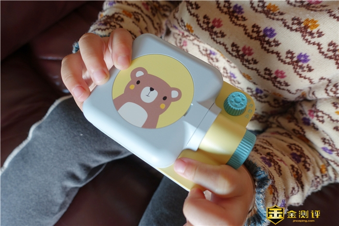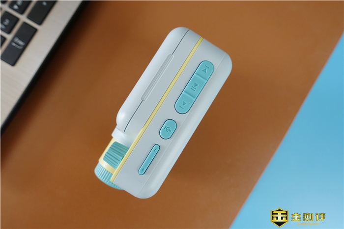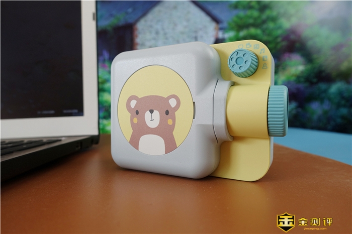 孩子喜欢的才是最真实的,趣学伴儿童绘本故事放映机,整体外观也是非常的像一个放映机,这个外观设计还是值得点赞的,材质方面采用的是优质ABS材质外壳,具有安全坚固,抗摔耐用的特性,另外值得一说的是外壳四周也非常的圆润,手感也很舒适。 镜头处采用的是一个聚光镜与三组可调成像透镜卓越搭配,能够精度修正LED灯的放射方向,增加图像容差性,并且4层透镜的设计,投影效果更清晰。 在2米范围内能够呈现高清投影画质,画面也是细腻更自然。 这个小旋钮也是功能按键,同时也是点缀了产品本身,功能按键从左至右开启,分别是开关机,胶片放映,故事播放,儿歌,国学,我的收藏组成,旋钮也带有阻尼感,非常的不错。 机身的顶部是各类按键,分别是上下曲切换键,播放暂停按键、语音按键、音量按键组成,按键为硅胶的材质,手感很好,孩子按起来也方便。 另外一侧则是一个扬声器,这个扬声器和整体风格也很搭,音量也很大,就算调节到最大声,也不会破音。 充电接口上,采用的是Type-C充电口方案,内置的是2000mAh的锂电池,充一次电可以使用很久。 轻轻就掰就可以打开舱门,这个舱门采用的是磁吸的设计,开启和关闭都非常的方便,并且内置了一卷胶片,这也是产品的标配。 当然这个胶片可以随时更换,每个胶片会带有一个图文+音频匹配的故事,也可以通过官网进行购买其它胶片。