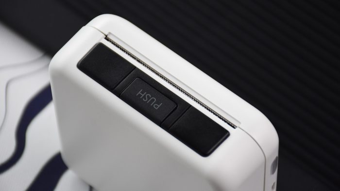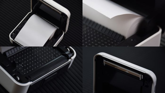 按下这一侧中间的PUSH键打开盒盖,用于打印的热敏纸就安装在其中,纸张宽度是57mm,和超市用的小票纸基本差不多。靠近出纸口一侧是用于着色的组件,另一侧是激光照射组件,相互配色完成热敏打印操作。