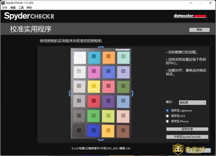SpyderCHECKR导入图片后,图片的四周都有蓝色的箭头,要保证取样点与图片色块的中心对齐。保存选项有饱和度、色度与肖像三种模式可以选择,可根据需要选取。