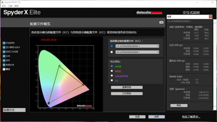 校准后除了生成配置文件之外,还有亮度、白点、磷光点、DeltaE以及光度的数据产生,提供校色的前后对比。