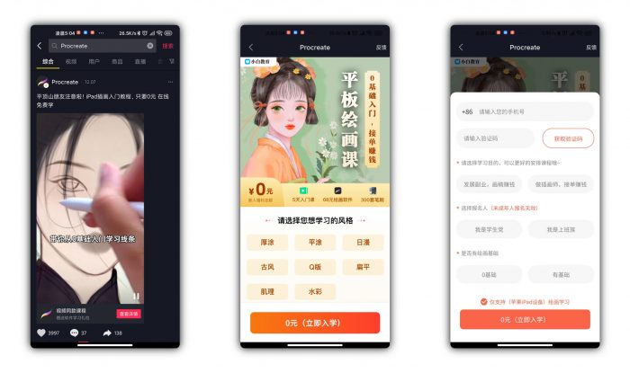 这是南卡 Pencil 主动式电容笔和 iPad 在一起的样子,看起来还不错吧。下面给大家介绍下怎么免费获得 Procreate 这个软件哈,打开抖音搜索“Procreate”,找到“Procreate”官方号发布的 iPad 插画入门教程广告,点进去填写基本信息0元入学后,添加辅导老师就可以得到“Procreate”软件的下载方式了,不但有免费的软件,还有免费的插画入门课程,有需求的小伙伴快去找找看吧。