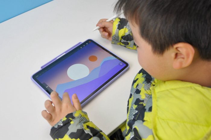 这是我儿子看第一节课画的插画,他跟着课程学会画圆的那一刻感觉好开心呀,他说原来iPad还能这么好玩。画画的时候即便他把整个手掌放上去也没关系,可以看到画面依旧非常简洁,全局防误触确实好用。我只让他学习了认识软件简单基础介绍和第一节的暮光山色,以后就让他发挥自己的想象力自由绘画吧。