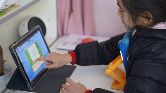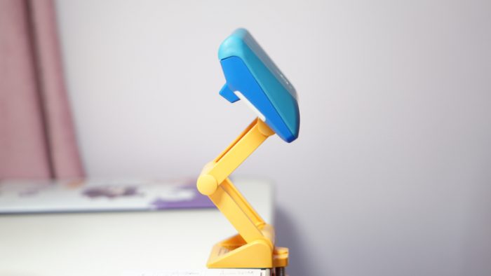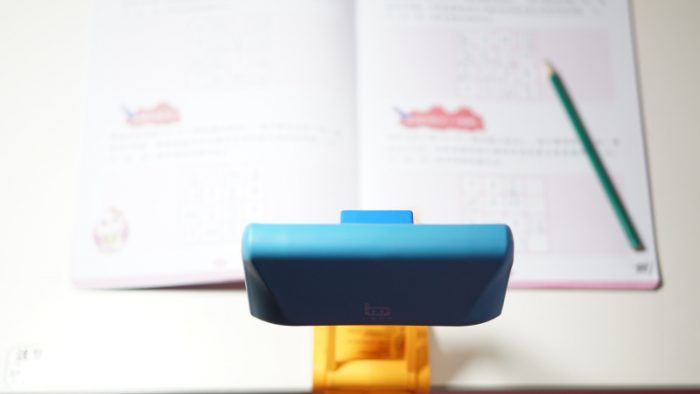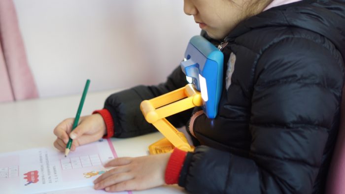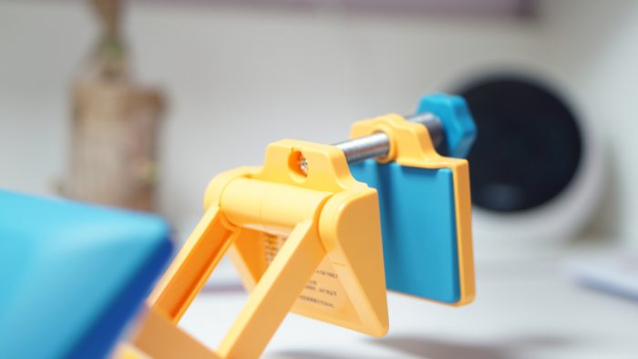 矫正器的使用相对来说也是比较简单的,紧固在桌板上之后,通过拉伸让带有“UBOT”图标的硅胶面与身体平行,同时矫正器整体高度距离下巴3-4cm,具体哪个位置最合适还是需要家里的小朋友来一起配合调整。