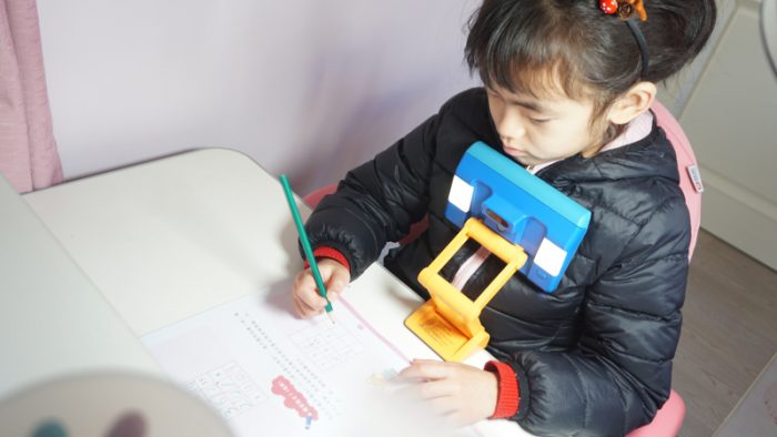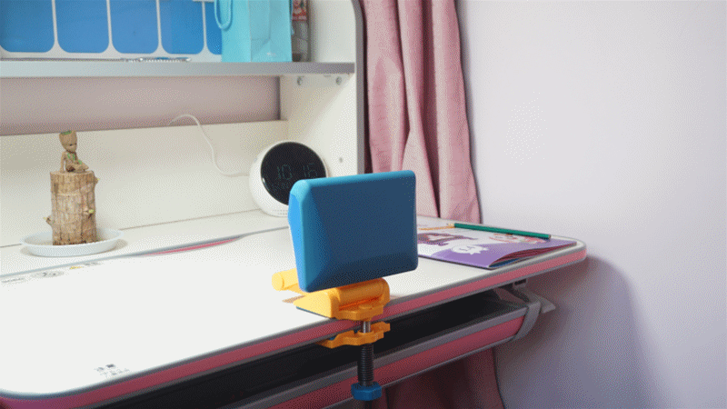 通过调整矫正器的角度位置,可以实现投影画面的位置改变,适应不同状态下的使用需求,比如在阅读或者是使用平板上网课的时候角度可以调高一点,而在做作业书写的时候可以调的底一点,让孩子能第一时间看到投影内容。