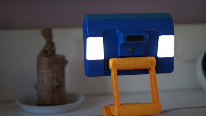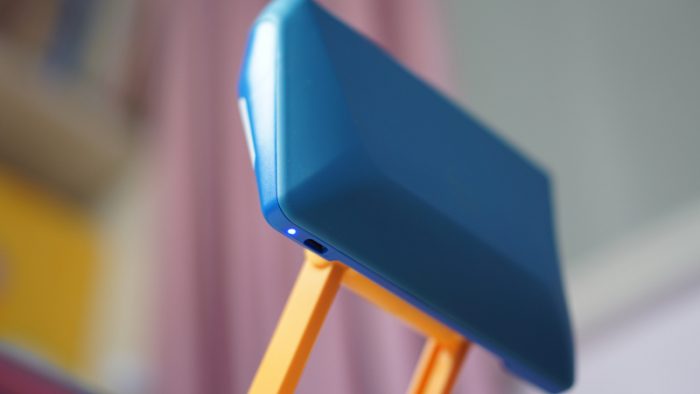 左下角是type-c的充电口和工作指示灯,电源开关则设计在了另一面,为了更好的展示,将矫正器反向安装,中央的长条形为红外感应接收器,下方的圆形则是投影灯,分布两侧的是两枚补光灯,右下角的就是电源键了,长按控制设备开关,短按则是调节补光灯亮度,5档调节,满足更多需求。当外界光线不佳,可通过手动调节矫正器补光亮度,防止外界灯光不足对儿童视力的损害。