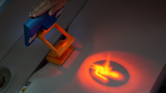 一旦身体前倾,胸口或者下巴接触矫正器,投影灯会立刻投影出红色图标进行提醒。图标的内容也是一个小人端坐在椅子上的画面,不论白天还是晚上,都能很清晰的看到。