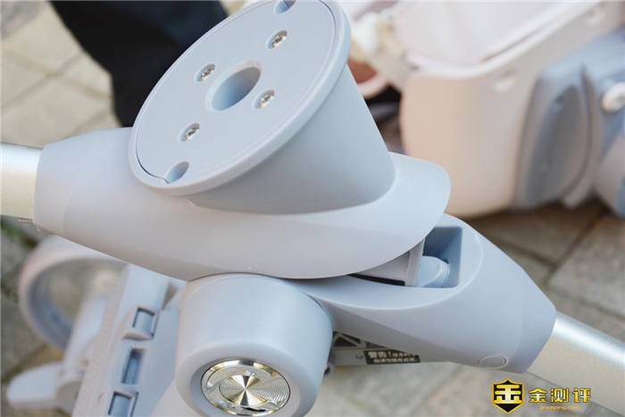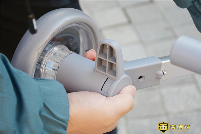 首先是支持三档调节的手推杆,它可以根据实际使用需求,自主的调节推杆的长度,满足150cm至180cm不同人群的使用需求。且此处需要指出的是,车杆采用的是高反光材质,夜间使用安全性能加倍。