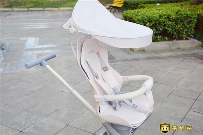 由于笔者家是女宝,所以选择的是奶昔粉配色,与一般的粉色对比,色泽的鲜艳度要相对淡一点,这与机身的另外两种灰、银相比,反而显得更为协调与轻奢。当然,如果你家是男孩,酷骑小推车M1还有酷奇绿以及雅致灰两种配色,前者使用的是黄色、紫色以及黑色三种色调,整体配色相对要活泼很多。