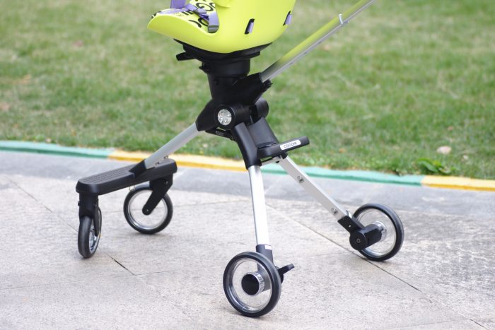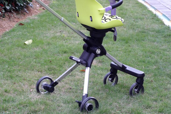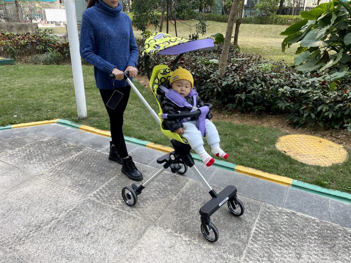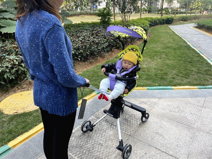 其实这款溜娃神器最能吸引我的功能还是高景观座椅,离地面足足有62CM距离,目前市面上能有这个高度的高景观手推车找不出几个,笔者在某宝找了半天,几乎都是55CM左右的高度。不过离地高也就意味着重心高,有不少家长肯定担心的侧翻问题。笔者特意测试了一下,COOGHI酷骑溜娃神器推行起来还是很稳固的,约56CM的轮距,能大大降低外部冲击时侧翻的几率。