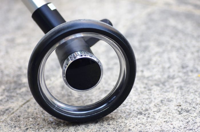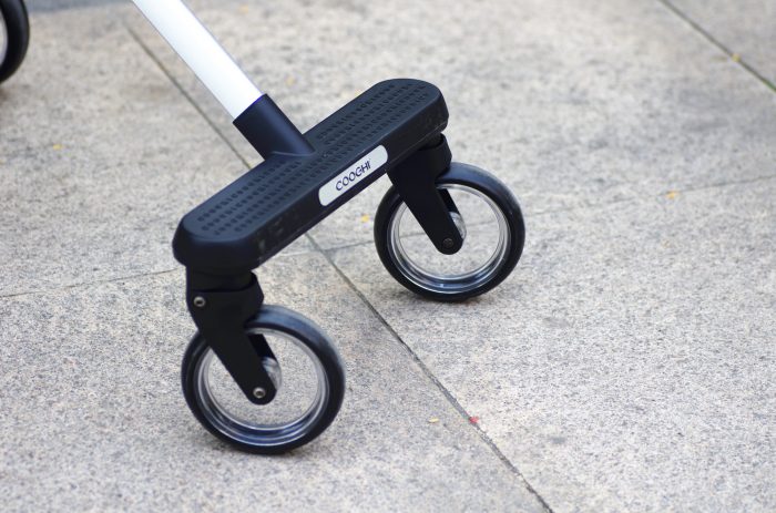 COOGHI酷骑溜娃神器不仅车架用料上乘,连车轮这个不起眼的部件也没吝啬,四个轮子都采用的是耐磨减震极佳EVA发泡材质,而且每个轮子内圈设计成透明材质,看上去颜值超高,如果能内置几个发光二极管那就更佳完美了。另外值得一提的是四轮上均采用了独立式的避震设计,前面两个轮子是双弹簧减震设计,而后面两个轮子轮距做了加宽设计,使得整车推起来更佳平稳,无惧各种凹凸不平的路面。