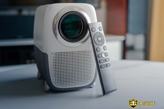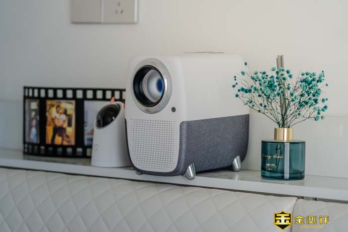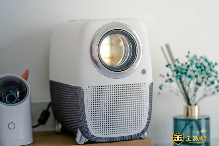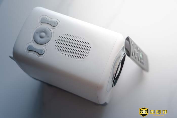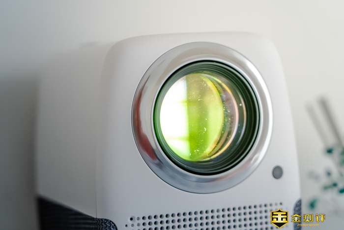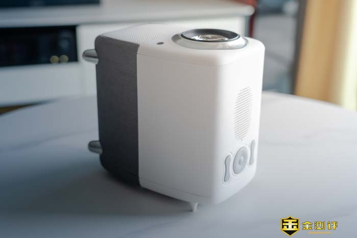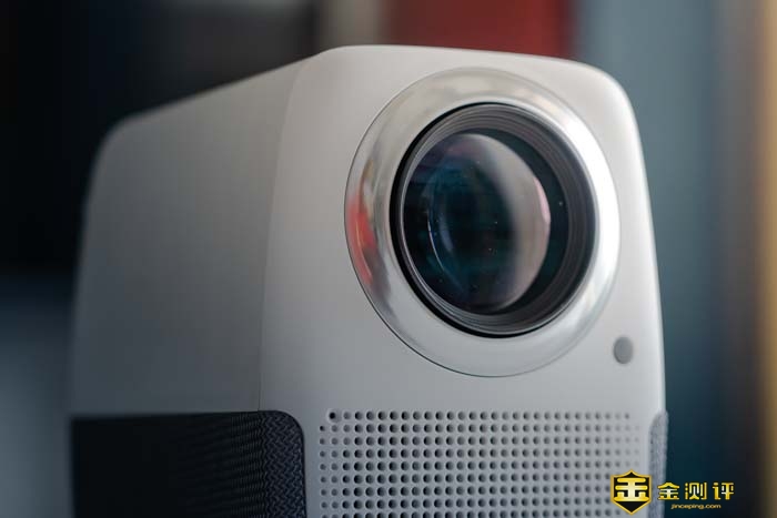 整个投影仪的正面几乎都被一个镜头所覆盖。远远一看就如同一只大眼一般,还非常的可爱有灵性。镜头没有保护盖,但好在镜头的周圈装饰凸出比较高,可以给镜头起到一定的保护作用。