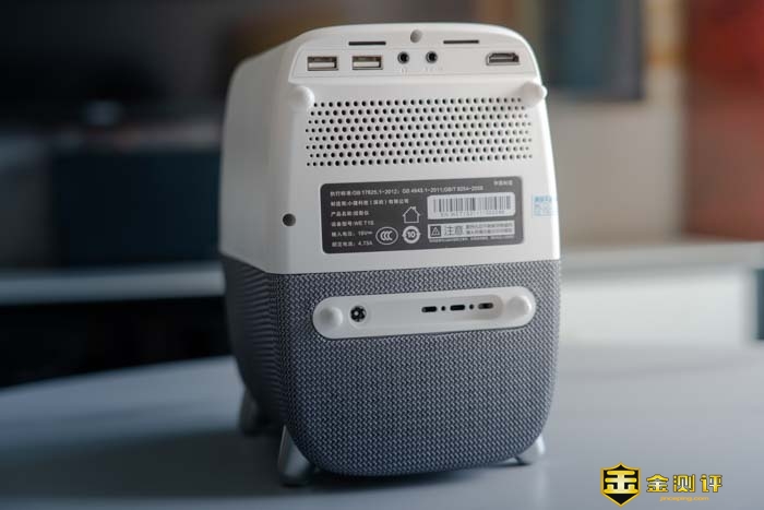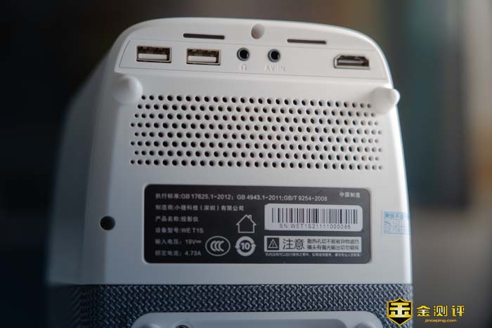 再来看看投影仪的背面。样的也是布满了散热孔。除此之外,还有2个USB接口,1个3.5mm的音频输出接口,1个3.5mm的AV输入,另还有一个HDMI 2.1的接口,下面还有一个DC电源输入口。