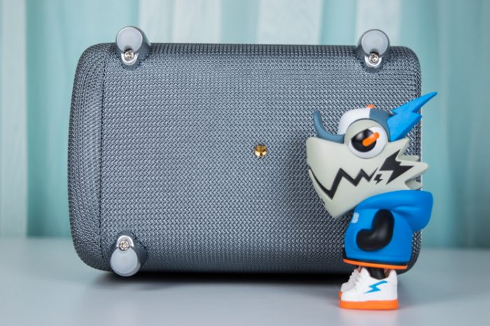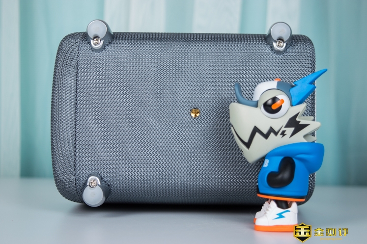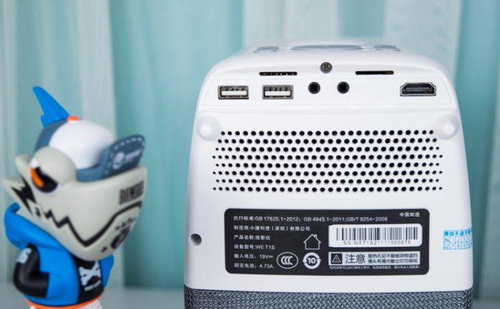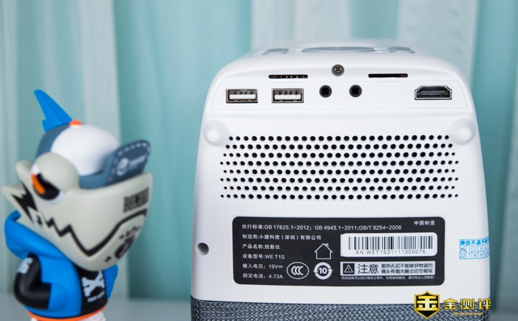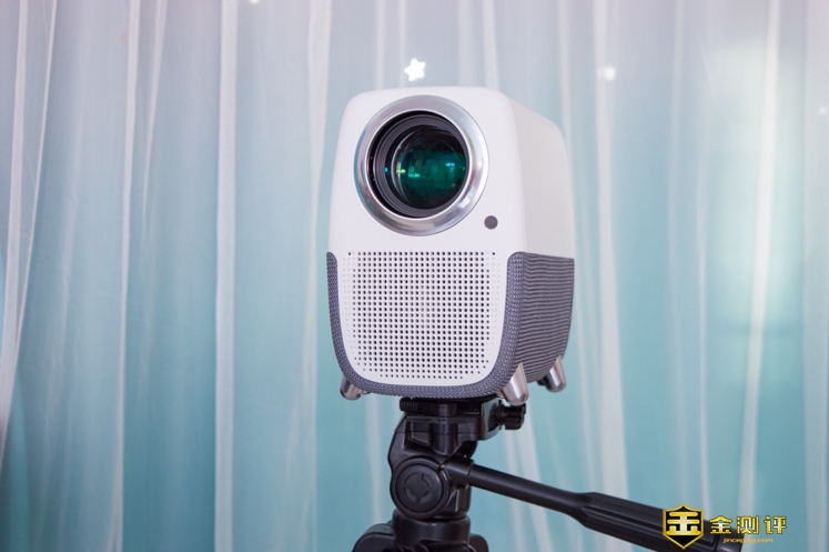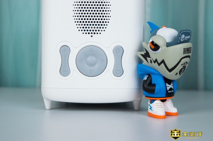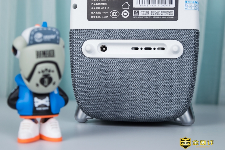 投影仪是立式使用的,采用了拼接的工艺。外观紧凑精致,织物可以增加摩擦力,防止搬动的时候手滑。在背部还可见到4个底脚,这款投影仪还可以垂直放置,将画面投射在天花板上面,使用方式灵活。