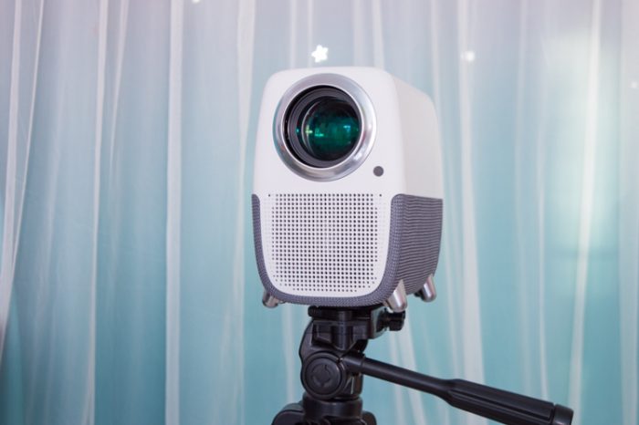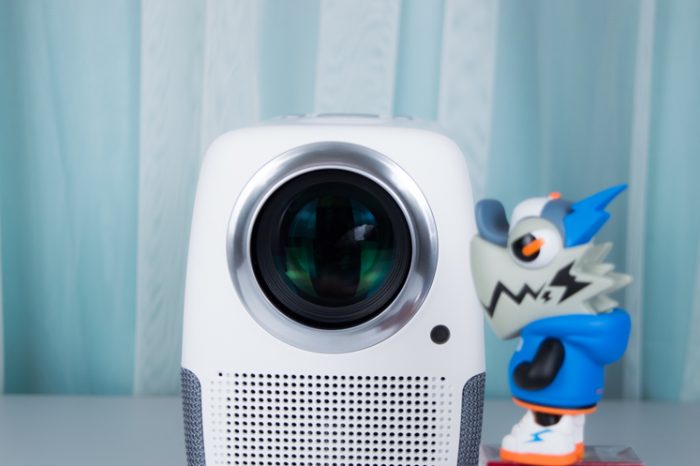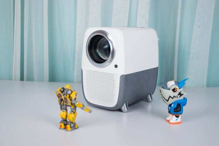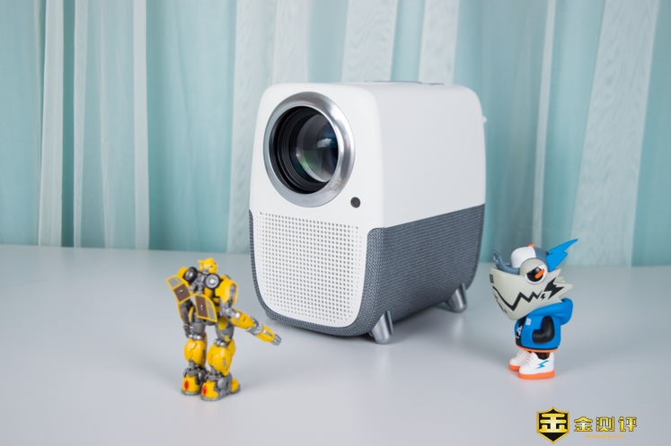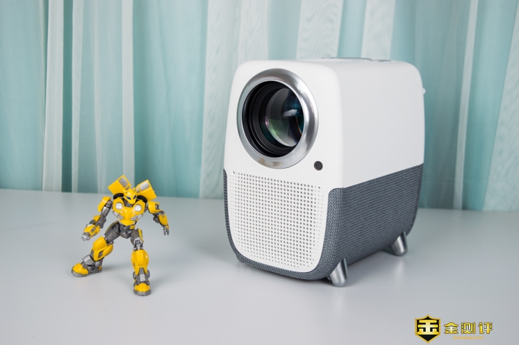 它的镜头非常大,整个投影仪的造型有点像个小黄人。投影仪采用了 LCD 显示技术,具有1080P的分辨率和540ANSI流明的亮度。镜头是全透镀膜玻璃,它的灯泡寿命有30000小时,按照每天播放8小时计算的话,可以使用10年以上。