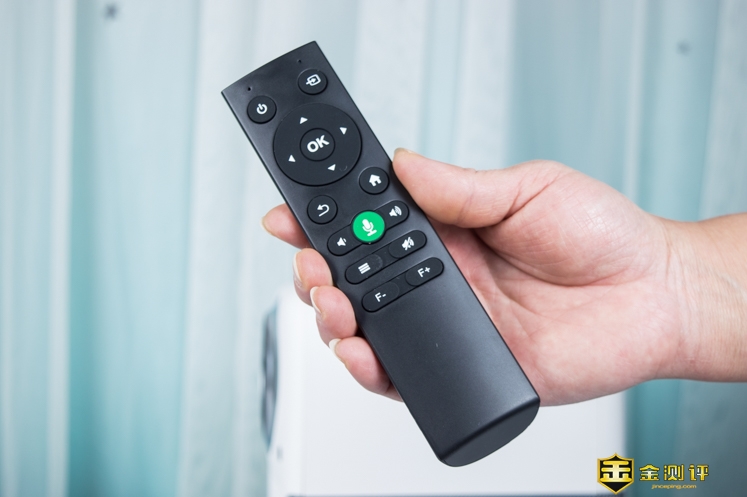 在附件当中除了电源适配器之外还有一个遥控器,并且赠送了两节干电池。相比精致的投影仪这个遥控器外观就有点太普通了。遥控器上面的按键有点多,并且方向键有点反人类的布置在上方,不太符合人机工程。不过它支持语音搜索,遥控器中间有一个很醒目的语音操作键。